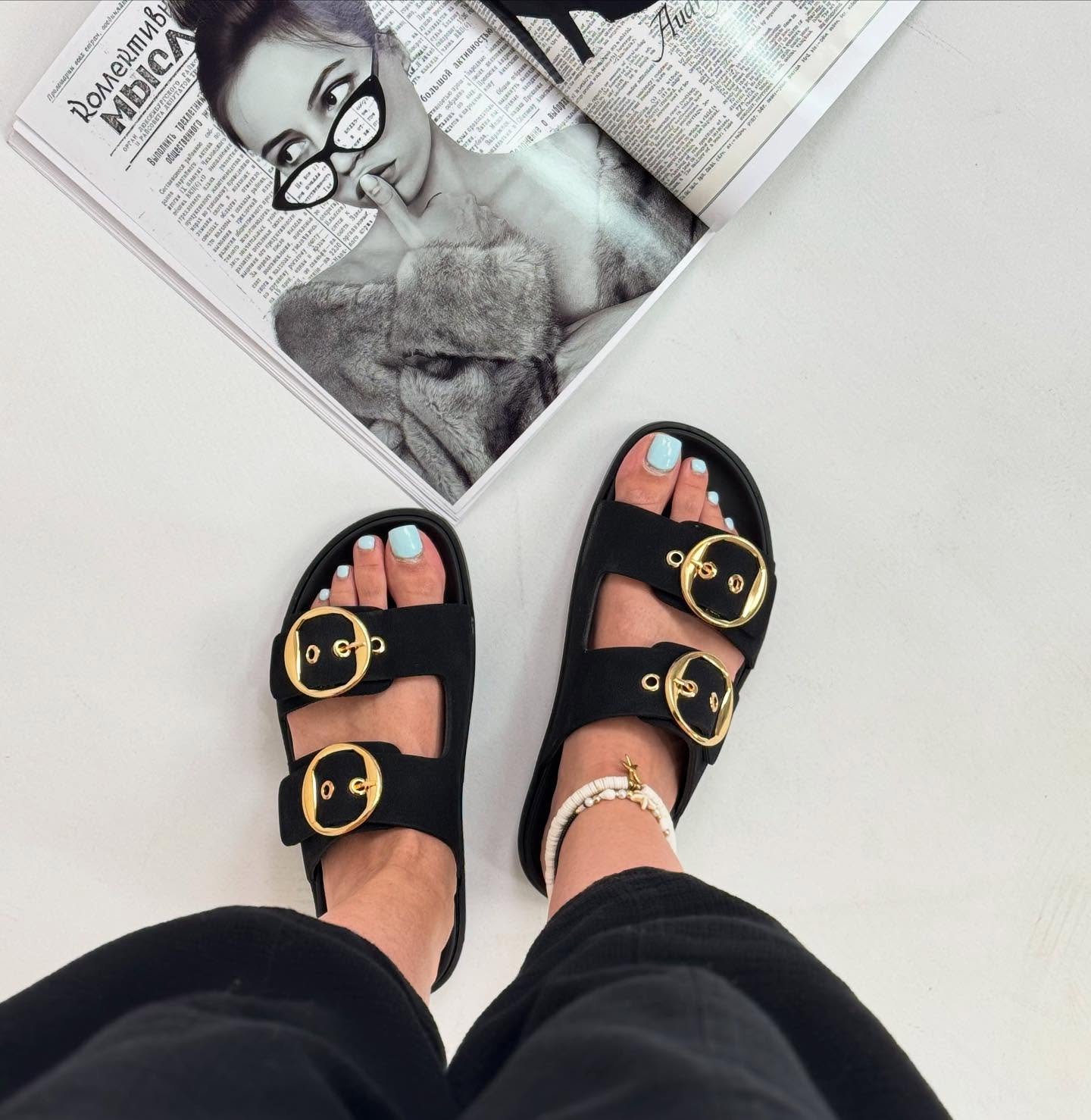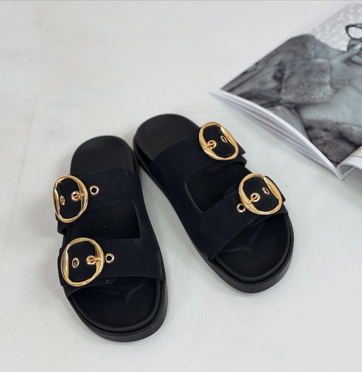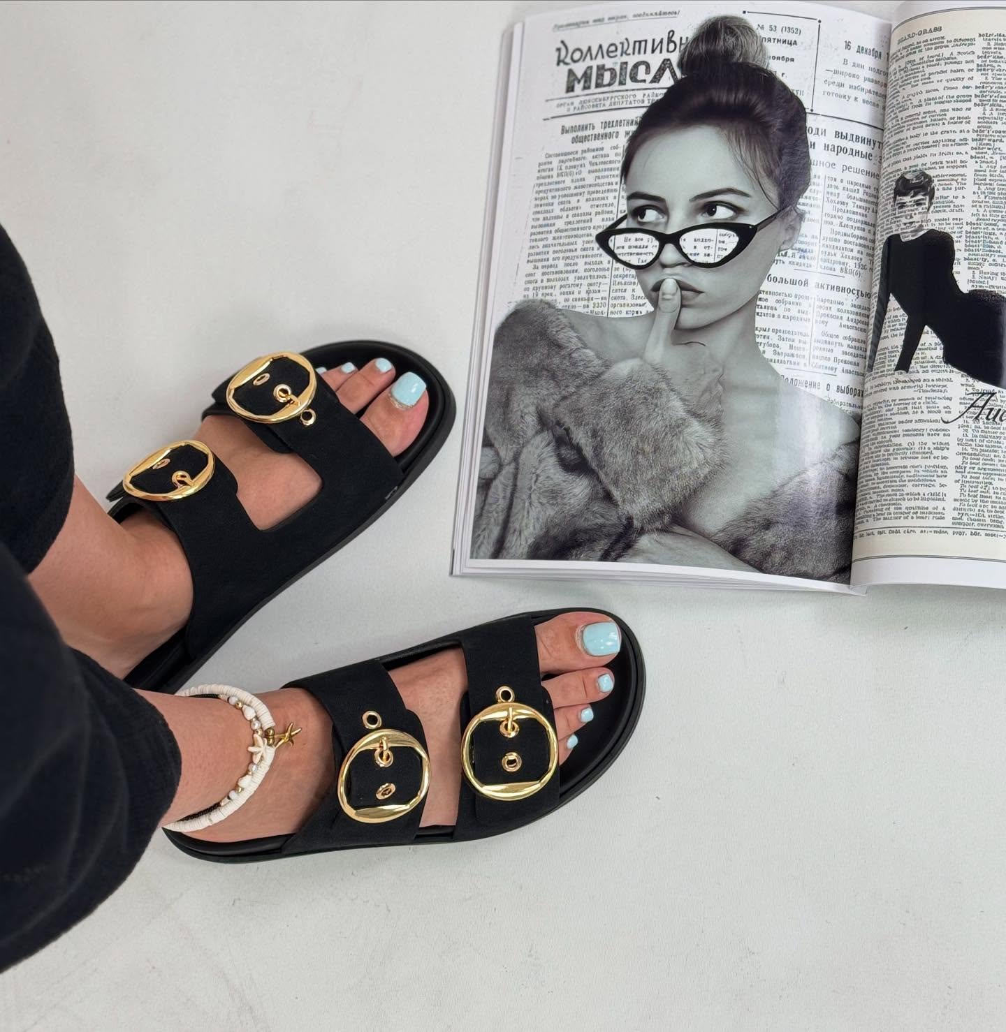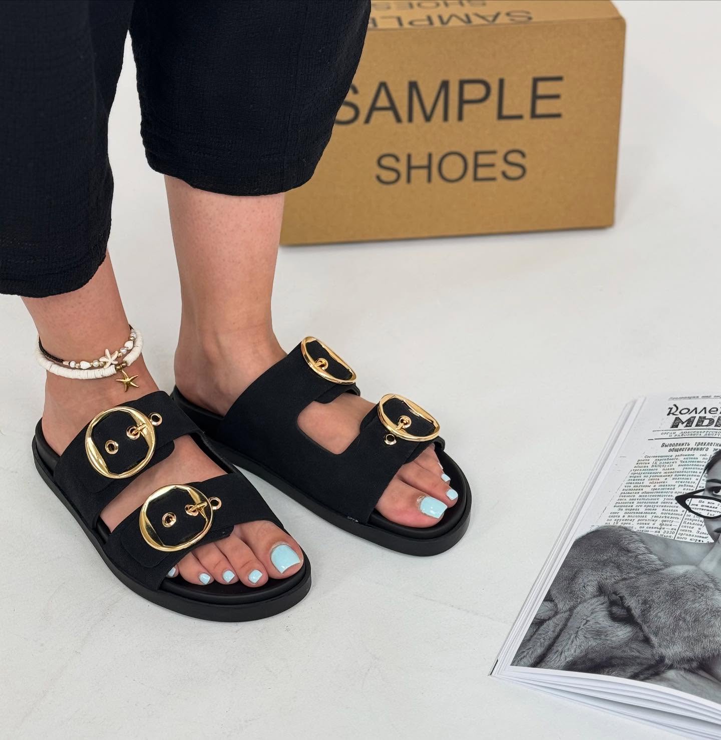 با این اسلیپرهای سگکدار مشکی و طلایی، راحتی و زیبایی را همزمان تجربه کنید! این صندلهای تخت و شیک، انتخابی ایدهآل برای روزهای گرم تابستان و بهار هستند. طراحی خاص آنها با دو سگک بزرگ طلاییرنگ براق بر روی بندهای پهن مشکی، جلوهای لوکس و چشمنواز به استایل شما میبخشد. جنس رویه نرم و راحت (احتمالاً جیر مصنوعی یا نبوک) در کنار کفی ارگونومیک، تضمینکننده راحتی پاهای شما در طول روز است.
