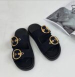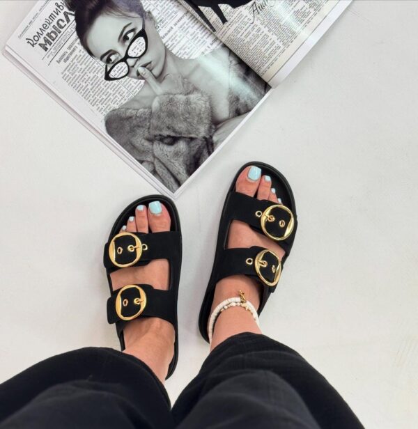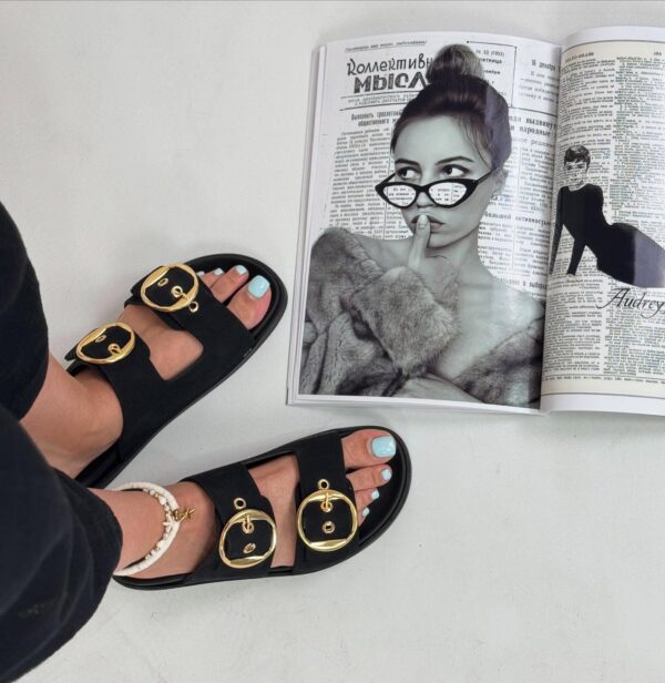با این اسلیپرهای سگک‌دار مشکی و طلایی، راحتی و زیبایی را همزمان تجربه کنید! این صندل‌های تخت و شیک، انتخابی ایده‌آل برای روزهای گرم تابستان و بهار هستند. طراحی خاص آن‌ها با دو سگک بزرگ طلایی‌رنگ براق بر روی بندهای پهن مشکی، جلوه‌ای لوکس و چشم‌نواز به استایل شما می‌بخشد. جنس رویه نرم و راحت (احتمالاً جیر مصنوعی یا نبوک) در کنار کفی ارگونومیک، تضمین‌کننده راحتی پاهای شما در طول روز است.