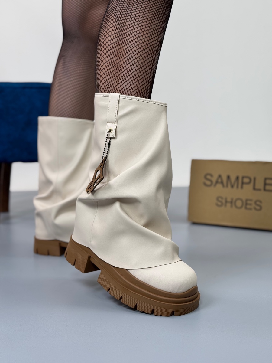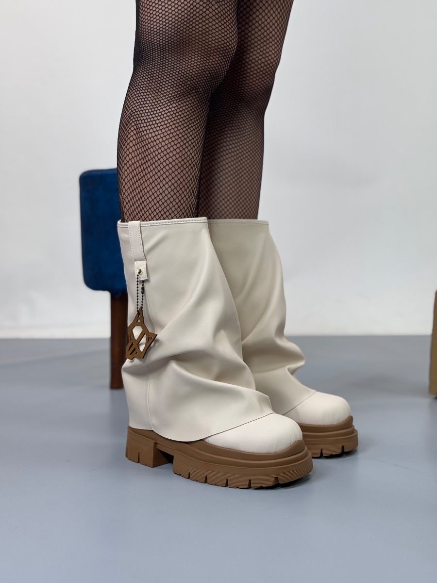 این بوت، تجسمی از ترندهای روز فشن است: قوی، راحت و کاملاً خنثی. ترکیب رنگ کرمی (Off-White) یا بژ روشن در قسمت ساق و رویه، در کنار زیره‌ی حجیم و آج‌دار قهوه‌ای، یک ترکیب رنگی زمینی و گرم را خلق کرده که به راحتی با هر لباسی ست می‌شود و حس آرامش و تمیزی را به استایل شما اضافه می‌کند.