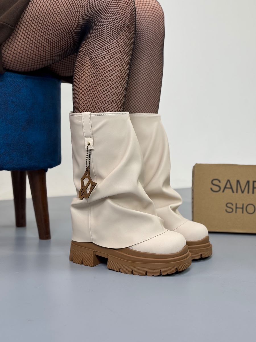 ساق آزاد و چین‌دار (Slouchy Shaft): طراحی ساق بوت به شکلی آزاد و کمی چین‌دار است که حالتی راحت و مدرن به آن داده و باعث می‌شود پوشیدن آن روی شلوار یا زیر دامن، بسیار شیک به نظر برسد.
