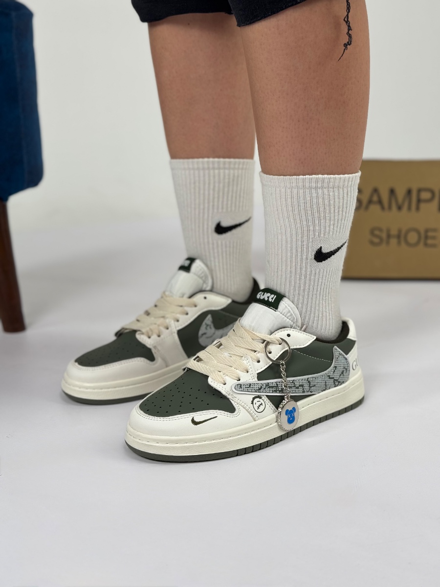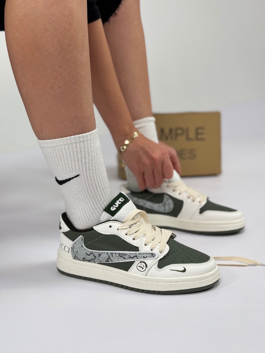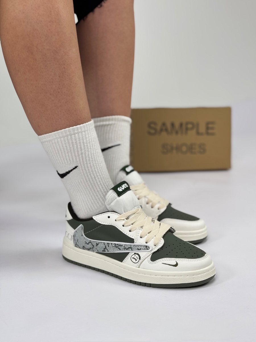 نایک ایر جردن ۱ لوو (Air Jordan 1 Low) – مدل خاص طرح تراویس/گوچی (سبز زیتونی/کرم)