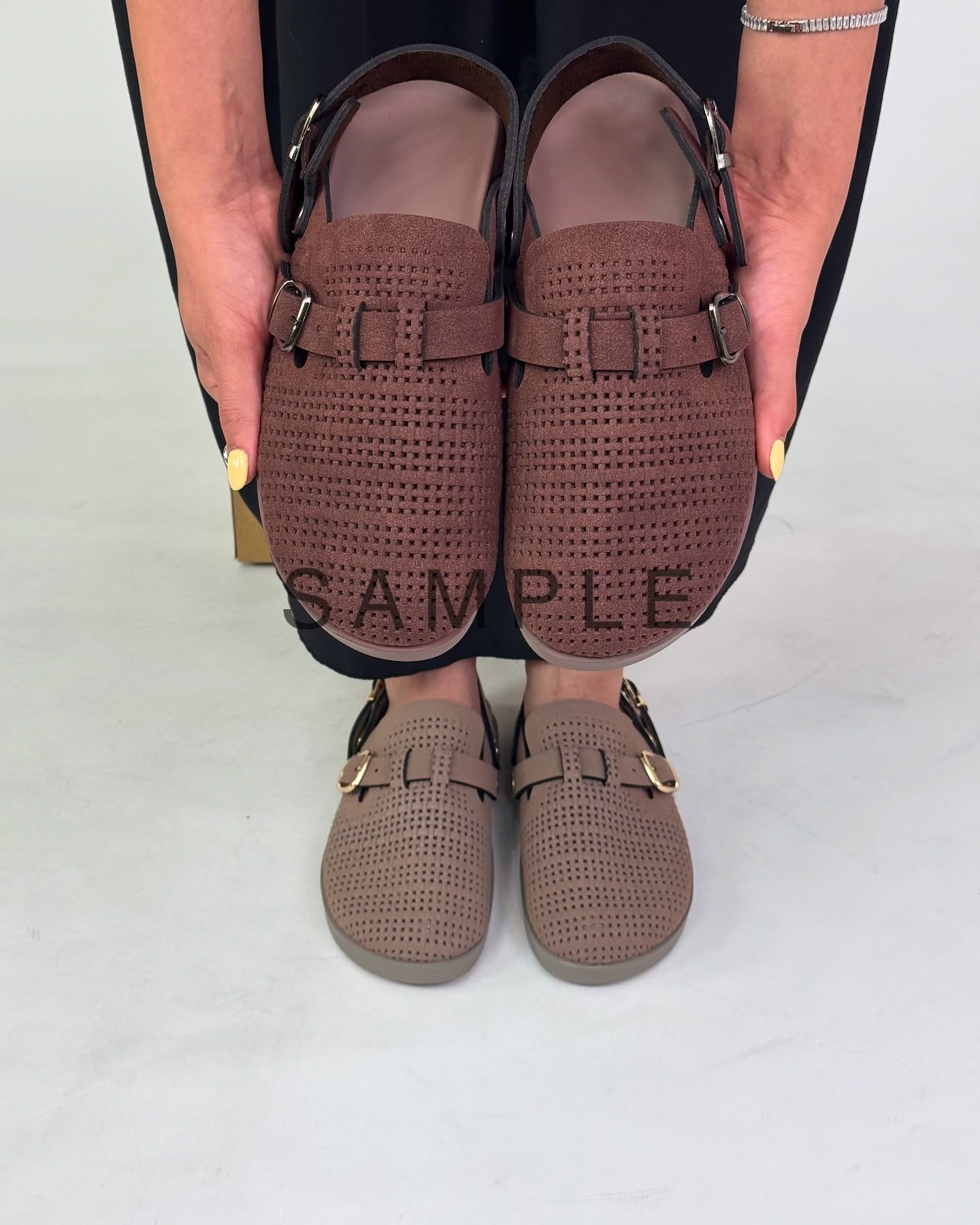 مهم‌ترین مزیت این صندل دو حالته قهوه ای سوراخ دار، قابلیت استفاده به دو شکل است: شما می‌توانید بند پشت پاشنه را بالا بیاورید و از آن به عنوان یک صندل با پایداری بیشتر استفاده کنید، یا بند را به سمت جلو فشار داده و آن را به یک اسلیپر راحت و دم دستی تبدیل کنید. این ویژگی، نهایت تطبیق‌پذیری را برای موقعیت‌های مختلف (از پیاده‌روی و خرید تا استراحت در خانه یا کنار استخر) به ارمغان می‌آورد. جنس سبک، نرم و منعطف این صندل، همراه با سگک‌های فلزی تزئینی (که به زیبایی و استحکام آن می‌افزایند)، تجربه‌ای بی‌نظیر از راحتی را در هر قدم تضمین می‌کند. این صندل‌ها، انتخابی هوشمندانه برای تابستانی پر از فعالیت و راحتی هستند.