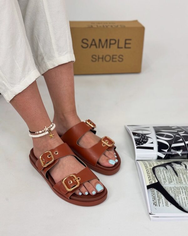 عنوان محصول: صندل دو سگک قهوه ای زنانه | راحتی و استایل کلاسیک برای روزهای تابستان