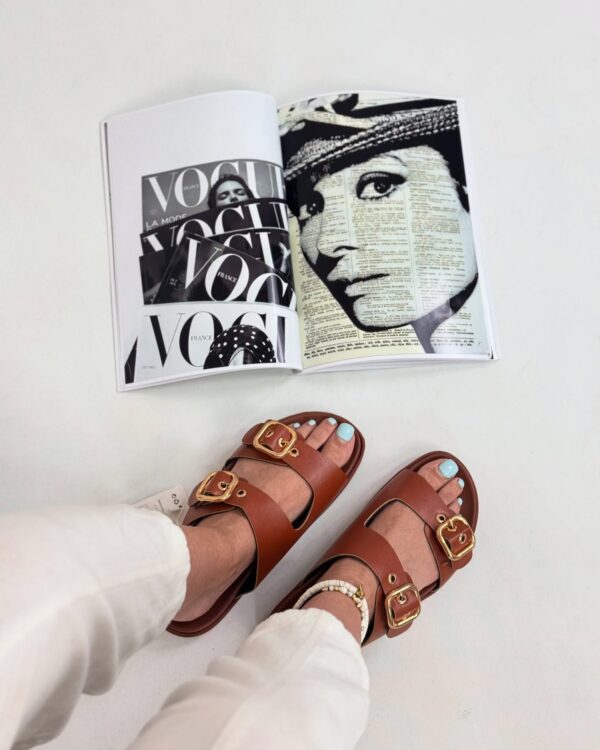 رنگ قهوه ای (عسلی/کنیاکی) این صندل، یک انتخاب فوق‌العاده گرم و طبیعی است که به راحتی با هر پالت رنگی و هر استایلی هماهنگ می‌شود. این رنگ، حسی از اصالت و لوکس بودن را القا کرده و آن را به یک آیتم همیشه‌مد در کمد لباس شما تبدیل می‌کند. ویژگی اصلی این صندل، وجود دو سگک بزرگ طلایی رنگ و براق بر روی بندهای پهن آن است. این سگک‌ها نه تنها به زیبایی صندل می‌افزایند، بلکه به عنوان یک المان دکوراتیو برجسته عمل کرده و به آن ظاهری مدرن و به‌روز می‌بخشند.