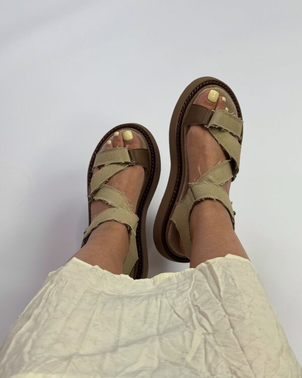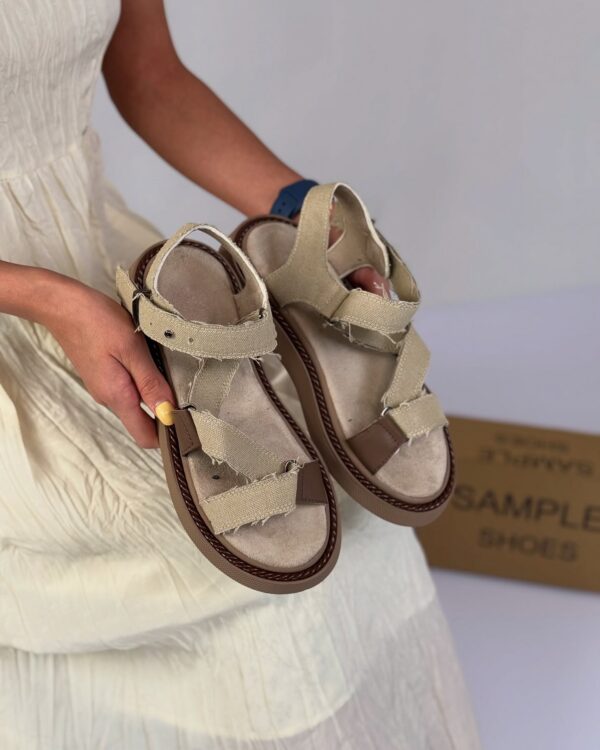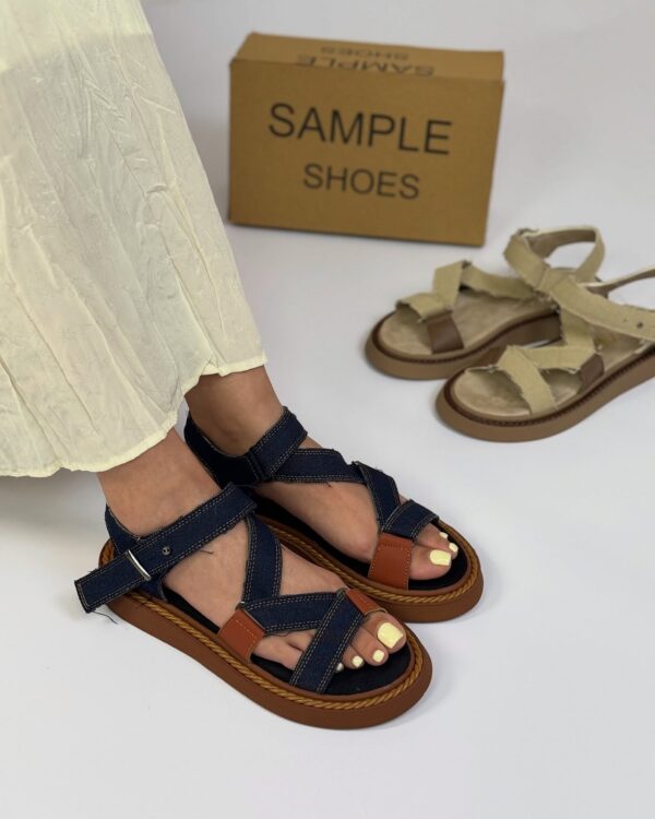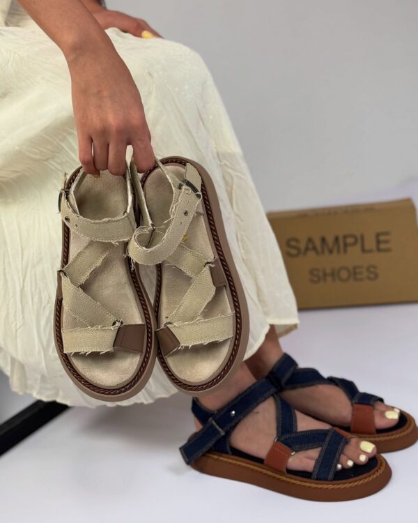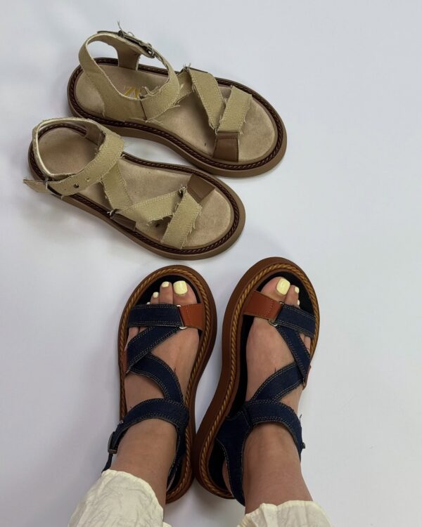 این صندلها در دو رنگ جذاب و کاربردی عرضه میشوند: رنگ پرطرفدار آبی جین با جزئیات قهوهای سوخته در قسمت میانی بندها، و رنگ خنثی و شیک کرم. بندهای پهن و ضربدری از جنس پارچهای نرم و مقاوم، به خوبی روی پا قرار گرفته و با فرم آن هماهنگ میشوند، ضمن اینکه قابلیت تنفس پوست را فراهم میکنند. جزئیات برجسته زیره با طراحی نواری و رنگ قهوهای طبیعی، حس و حال تابستان و طبیعت را به این صندلها میبخشد و ظاهری منحصربهفرد ایجاد میکند.