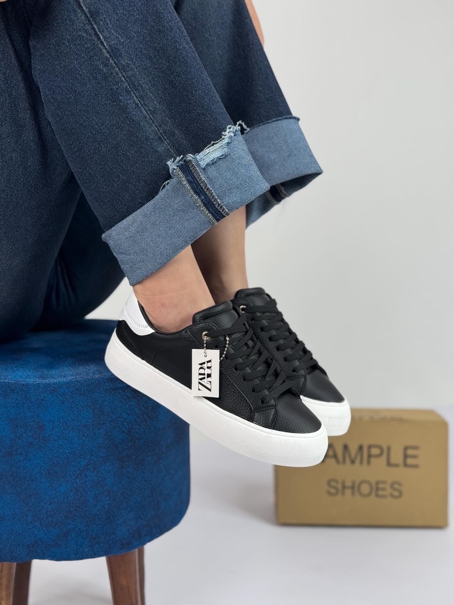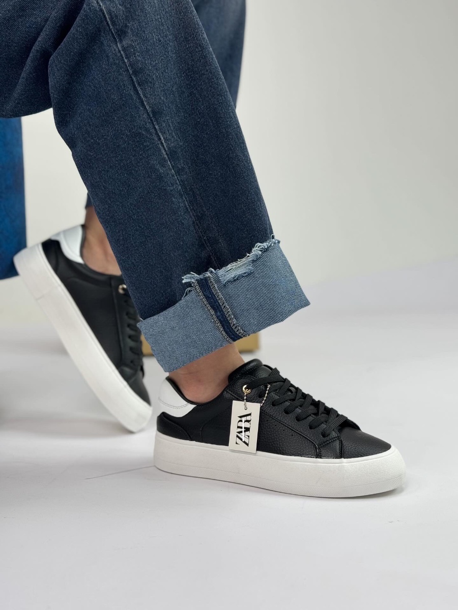 🖤 مشخصات محصول: کتانی پلتفرم چرم م🖤 مشخصات محصول: کتانی پلتفرم چرم مصنوعی زارا (Zara Faux Leather Platform Sneaker)این محصول یک کتانی روزمره (Sneaker) با طراحی مینیمال و زیره‌ی پلتفرم است که استایلی مدرن و شیک را به ارمغان می‌آورد.✨ جزئیات طراحی و ویژگی‌های کلیدیویژگیتوضیحاتمدلکتانی کژوال با زیره ضخیم (Platform Sneaker)جنس رویهچرم مصنوعی دانه‌دار مشکی (Textured/Pebbled Faux Leather). این جنس، ظاهری شبیه به چرم طبیعی ایجاد کرده و نگهداری آسانی دارد.رنگ‌هامشکی و سفید (Black & White Contrast). رویه کاملاً مشکی و زیره کاملاً سفید است که کنتراست جذابی ایجاد می‌کند.زیرهزیره‌ی پلتفرم (Platform Sole) سفید و یکدست که کمی ارتفاع را افزایش داده و ترند روز است.جزئیات کنتراستدر قسمت پشت پاشنه، یک تکه چرم مصنوعی سفید استفاده شده است که به شکستن رنگ مشکی کمک می‌کند.بند و آستربندهای مشکی رنگ، هماهنگ با رنگ رویه.برندینگبرچسب متصل شده به بند کفش متعلق به برند ZARA است که در اینجا برای بخش KIDZ دیده می‌شود (اگرچه مدل‌های زنانه نیز با همین طراحی عرضه می‌شوند).استایلمینیمال، شیک، مناسب برای استایل‌های خیابانی، کژوال و حتی نیمه‌رسمی (اسمارت کژوال).📝 نکات مهم برای سایت و معرفی محصولاستایل‌پذیری بالا: رنگ مشکی و سفید این کتانی، ست کردن آن را با هر لباسی آسان می‌کند. به ویژه برای ست کردن با شلوارهای جین، دامن‌های پلیسه، یا حتی کت و شلوارهای کژوال انتخابی فوق‌العاده است.راحتی روزمره: زیره پلتفرم اگرچه حجیم است، اما معمولاً کفی‌های این مدل‌ها برای پیاده‌روی‌های سبک روزانه مناسب طراحی شده‌اند و حس راحتی را فراهم می‌کنند.ترکیب ترند و کلاسیک: مدل کتانی کلاسیک (Tennis Shoe) با ترند زیره پلتفرم ترکیب شده که یک آیتم زمان‌مند با یک المان مد روز را به وجود آورده است.نکته درباره کیفیت (تکرار): مانند تمام محصولات برند زارا، این کتانی نیز بر اساس اصول فست فشن تولید شده است؛ یعنی تمرکز بر مد روز بودن و قیمت رقابتی، با کیفیت مناسب برای استفاده فصلیصنوعی زارا (Zara Faux Leather Platform