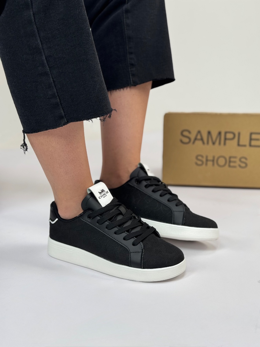 طراحی مونوکروم: رویه‌ی کفش از جنس پارچه‌ی مرغوب با بافت ظریف مونوگرام (لوگوی تکرارشونده) مشکی است که جلوه‌ای لوکس و خاص به آن می‌بخشد.