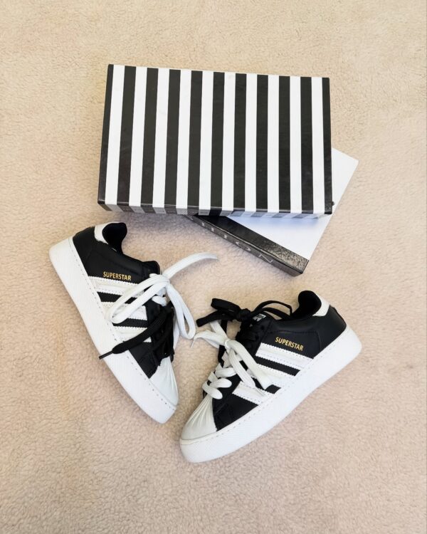 رنگبندی مشکی و سفید این سوپر استار، یک ترکیب کلاسیک و همیشهمد است. رویه اصلی کفش به رنگ مشکی بوده که بستری قدرتمند برای خطوط سهگانه سفید نمادین آدیداس فراهم میکند. سرپنجه صدفی (Shell Toe) سفید رنگ، که از امضاهای اصلی سوپر استار است، در کنار زیره سفید، کنتراست جذابی با رویه مشکی ایجاد کرده و به کفش جلوهای بینقص و هماهنگ میبخشد.