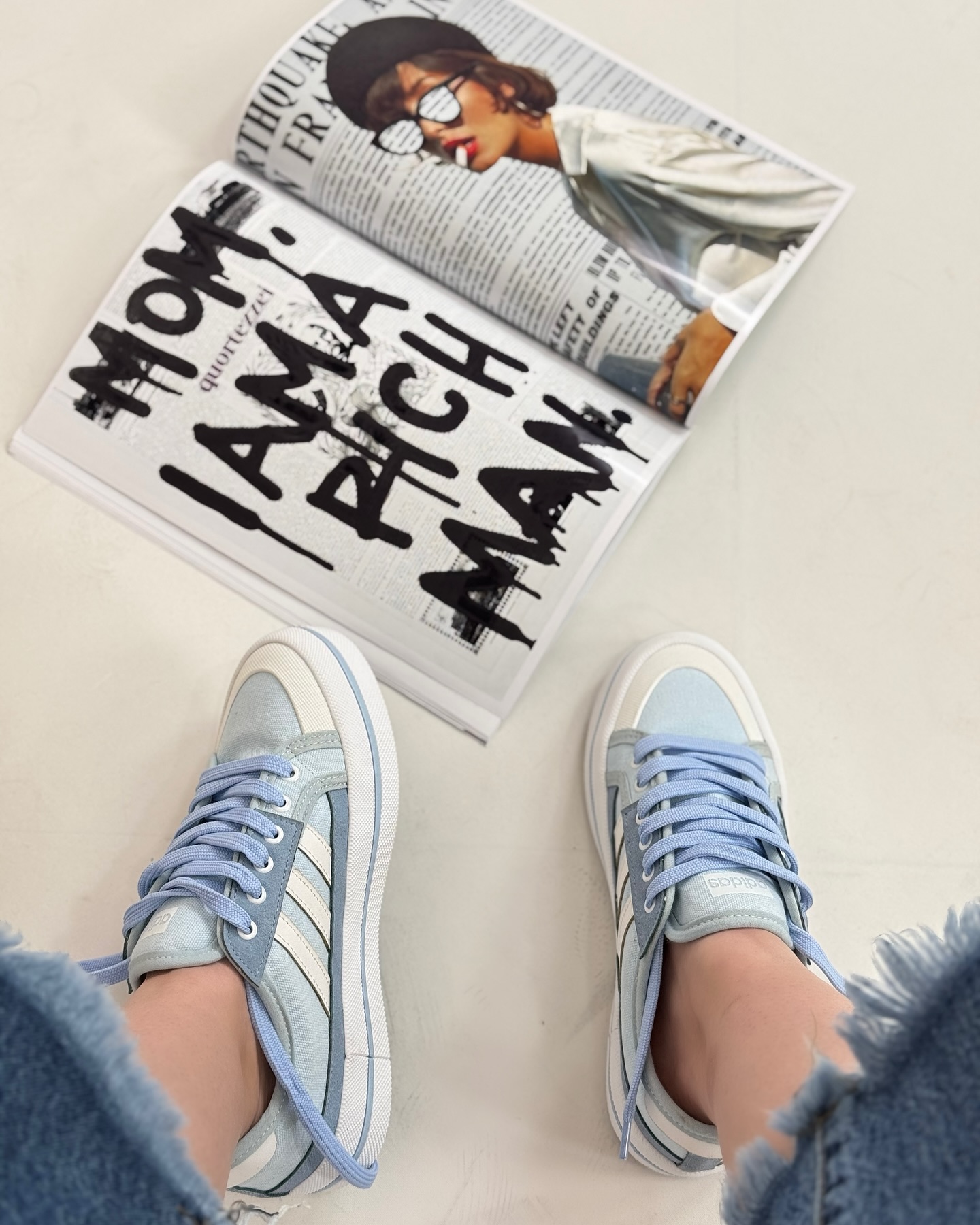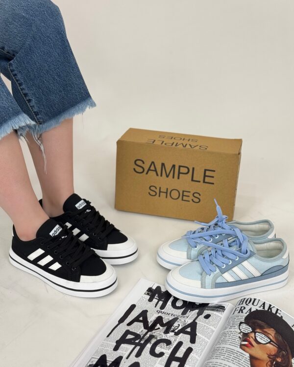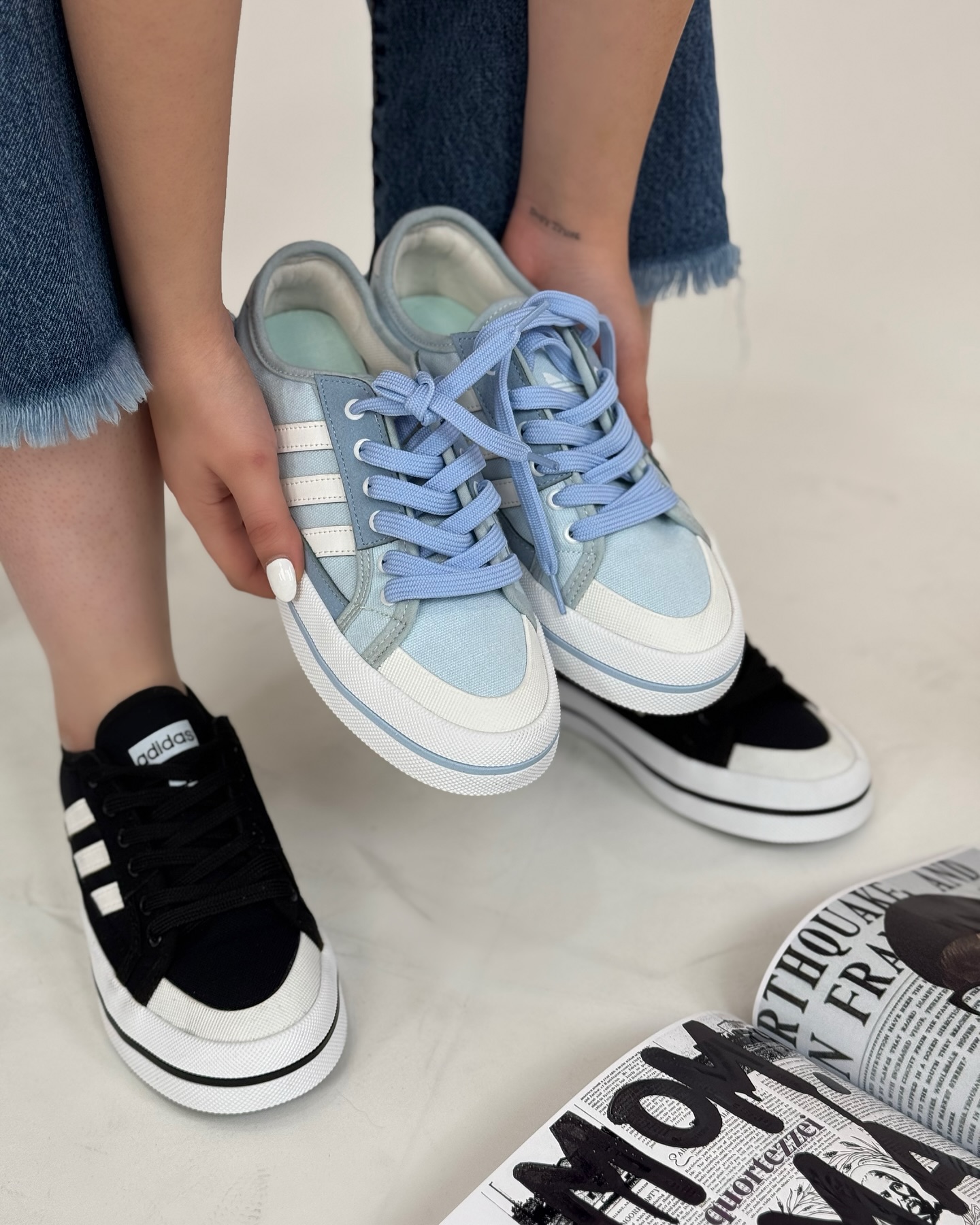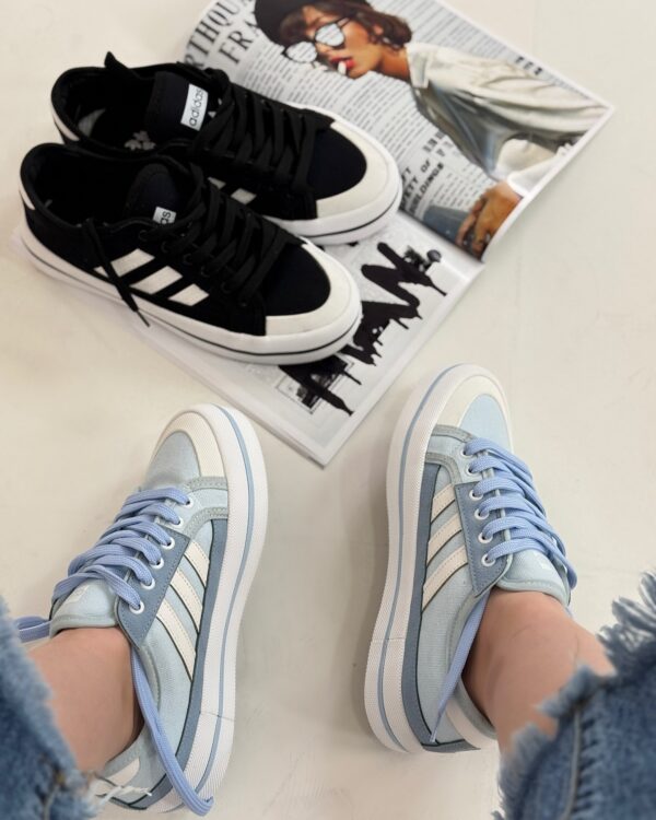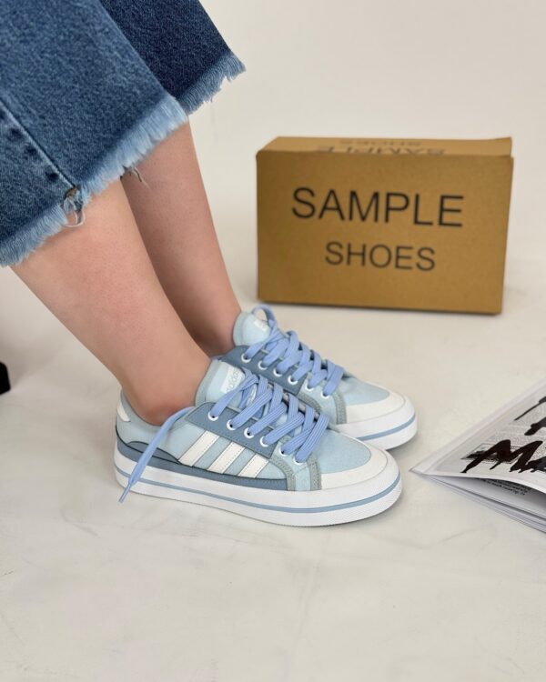 2. آبی روشن و سفید: (مدل روی پا در تصویر اول و چهارم) این ترکیب رنگی، حسی از طراوت، آرامش و لطافت را منتقل می‌کند. رنگ آبی روشن و آسمانی رویه در کنار خطوط و زیره سفید، انتخابی ایده‌آل برای فصل بهار و تابستان و استایل‌های شاداب و دخترانه است.