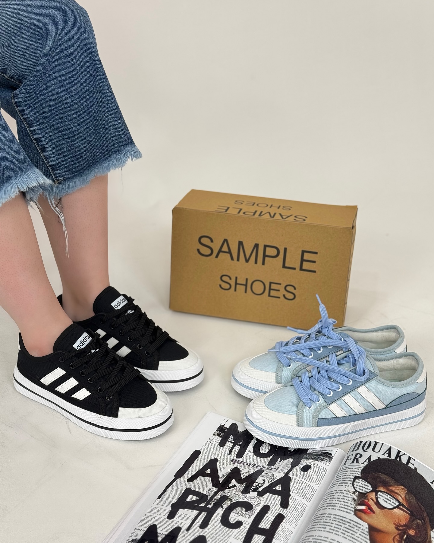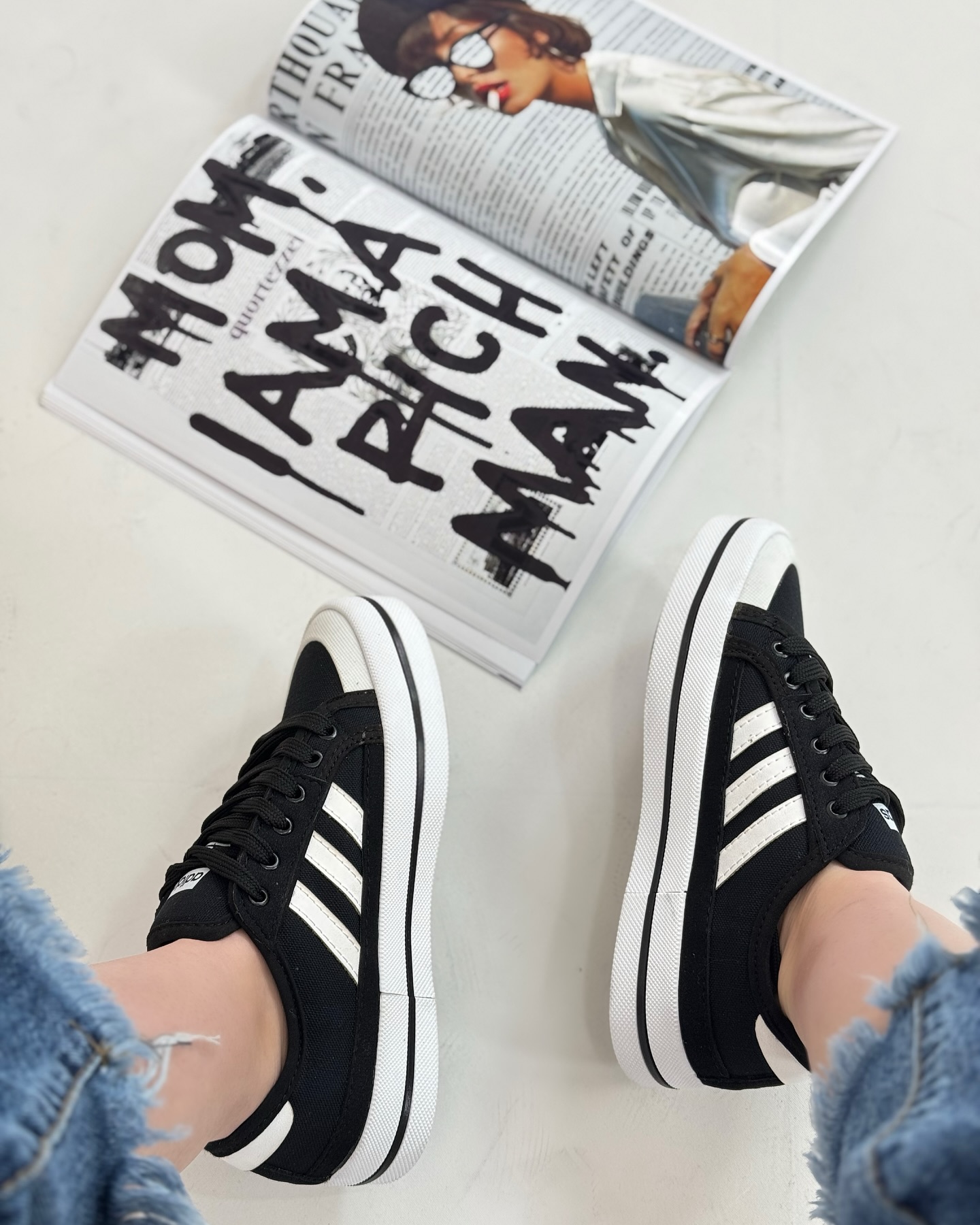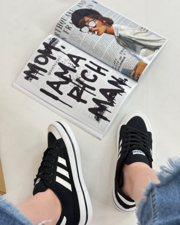 1. مشکی و سفید: (مدل روی پا در تصویر دوم و سوم) این ترکیب رنگی، نمادی از شیک‌پوشی بی‌قید و شرط است. رنگ مشکی عمیق رویه در کنار خطوط و زیره سفید، کنتراستی قدرتمند و در عین حال مینیمال را به وجود می‌آورد که برای هر استایل و موقعیتی، از روزمره تا کمی رسمی‌تر، مناسب است.