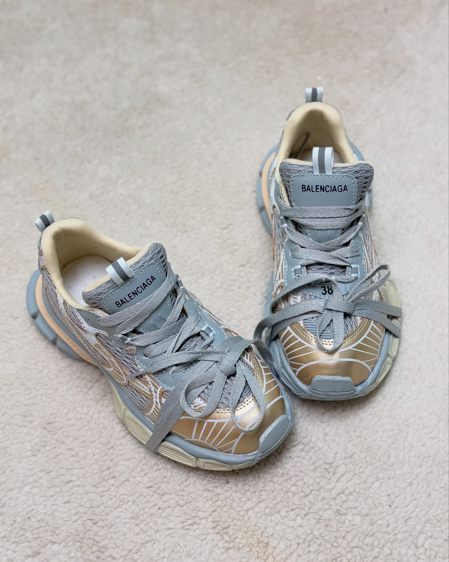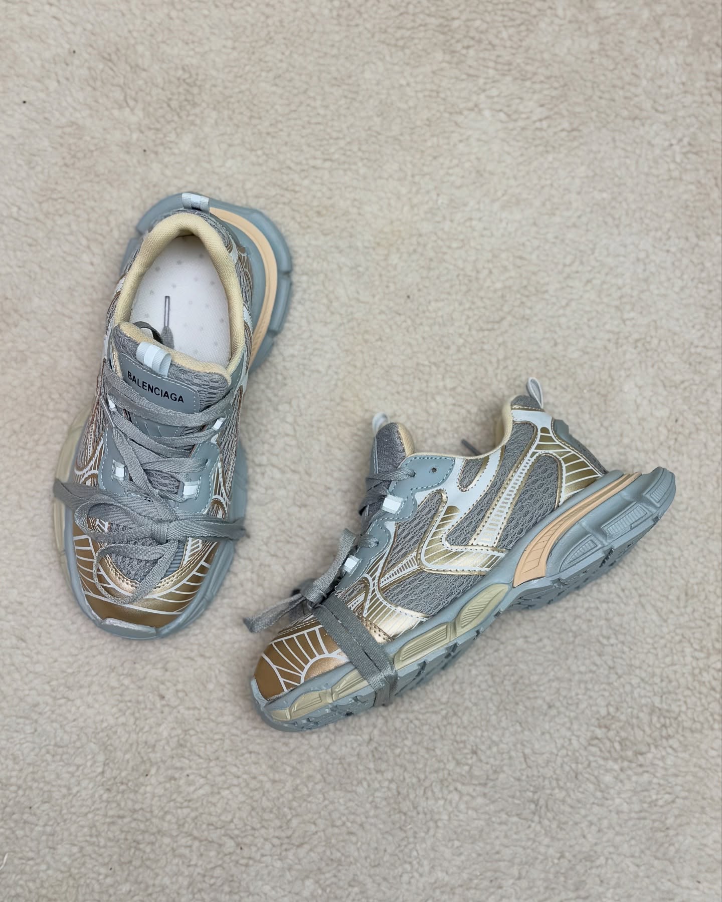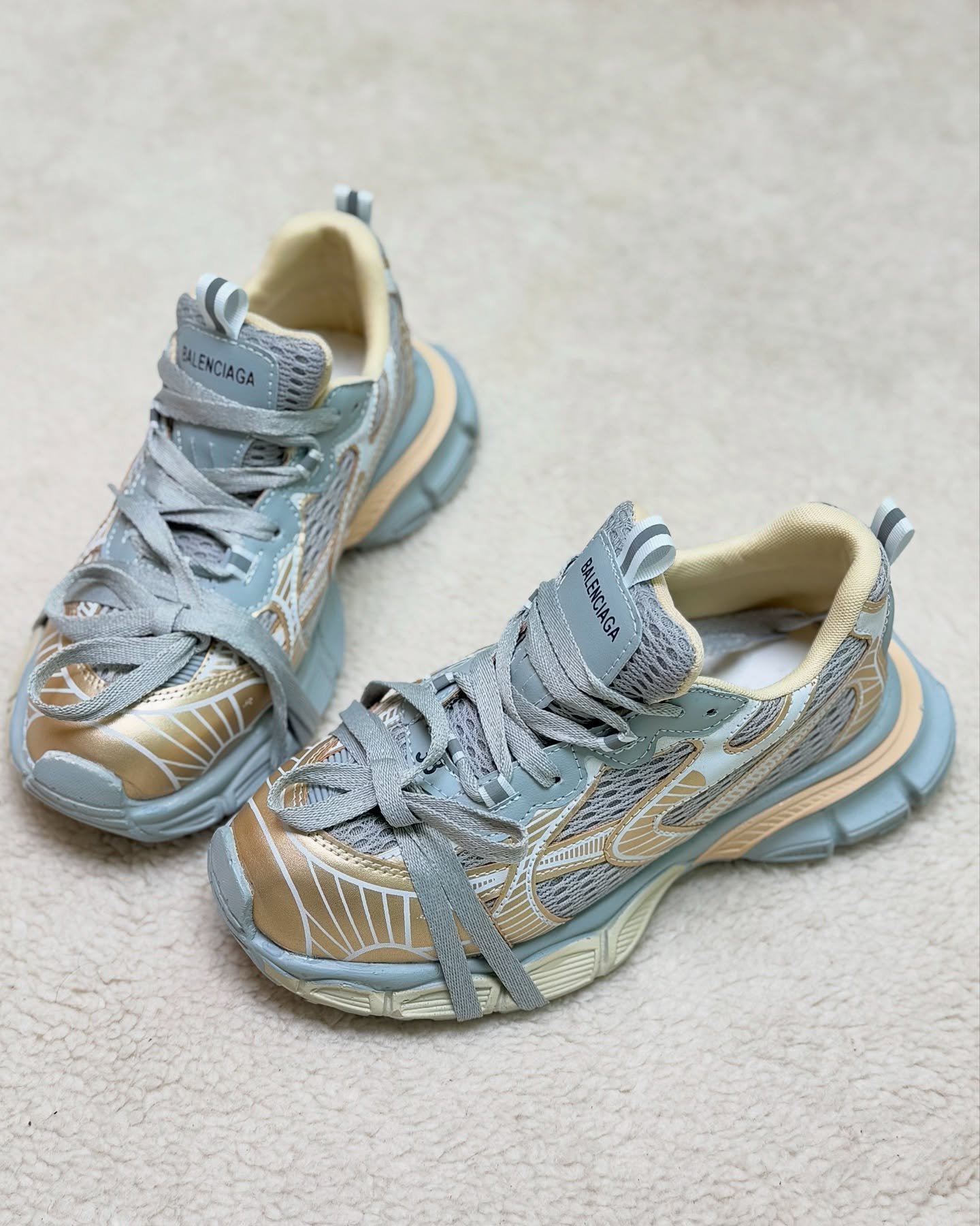 طرح اصلی این کتونی، بر پایه سیلوئت چانکی و چندلایه استوار است که عمق و بافتی خیره‌کننده به آن می‌بخشد. رویه کفش ترکیبی از پنل‌های مشبک و شفاف با لایه‌های مقاوم است که به زیبایی در کنار هم قرار گرفته‌اند. جزئیات برجسته در بخش‌های مختلف رویه و زیره، ظاهری پویا و مهندسی‌شده به کفش می‌دهند. نوشته “BALENCIAGA” به وضوح بر روی زبانه‌ی کفش حک شده که اصالت و جایگاه این طرح را برجسته می‌کند.