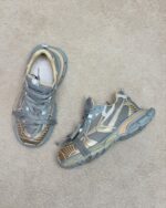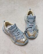 طرح اصلی این کتونی، بر پایه سیلوئت چانکی و چندلایه استوار است که عمق و بافتی خیرهکننده به آن میبخشد. رویه کفش ترکیبی از پنلهای مشبک و شفاف با لایههای مقاوم است که به زیبایی در کنار هم قرار گرفتهاند. جزئیات برجسته در بخشهای مختلف رویه و زیره، ظاهری پویا و مهندسیشده به کفش میدهند. نوشته “BALENCIAGA” به وضوح بر روی زبانهی کفش حک شده که اصالت و جایگاه این طرح را برجسته میکند.