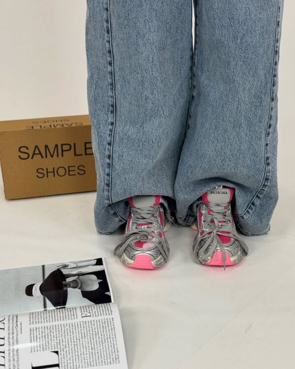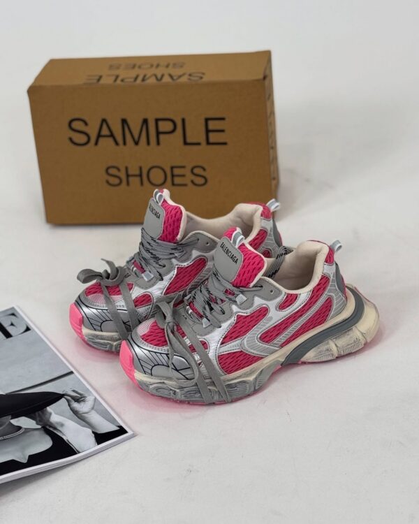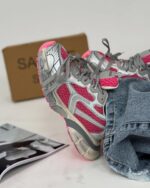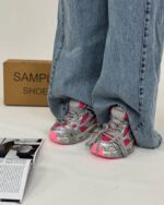ترکیب رنگی منحصر به فرد این کتونی، نقطه قوت اصلی آن است: صورتی پررنگ و شاداب در کنار پنلهای نقرهای متالیک و براق، و جزئیات طوسی خنثی که هارمونی زیبایی ایجاد کردهاند. این تلفیق رنگها، به کتونی ظاهری پویا و چشمنواز بخشیده که آن را از سایر مدلها متمایز میکند. طراحی چندلایه و پیچیده رویه، با استفاده از پنلهای مختلف و خطوط دینامیک، عمق و جذابیت بصری خیرهکنندهای را به ارمغان آورده است.