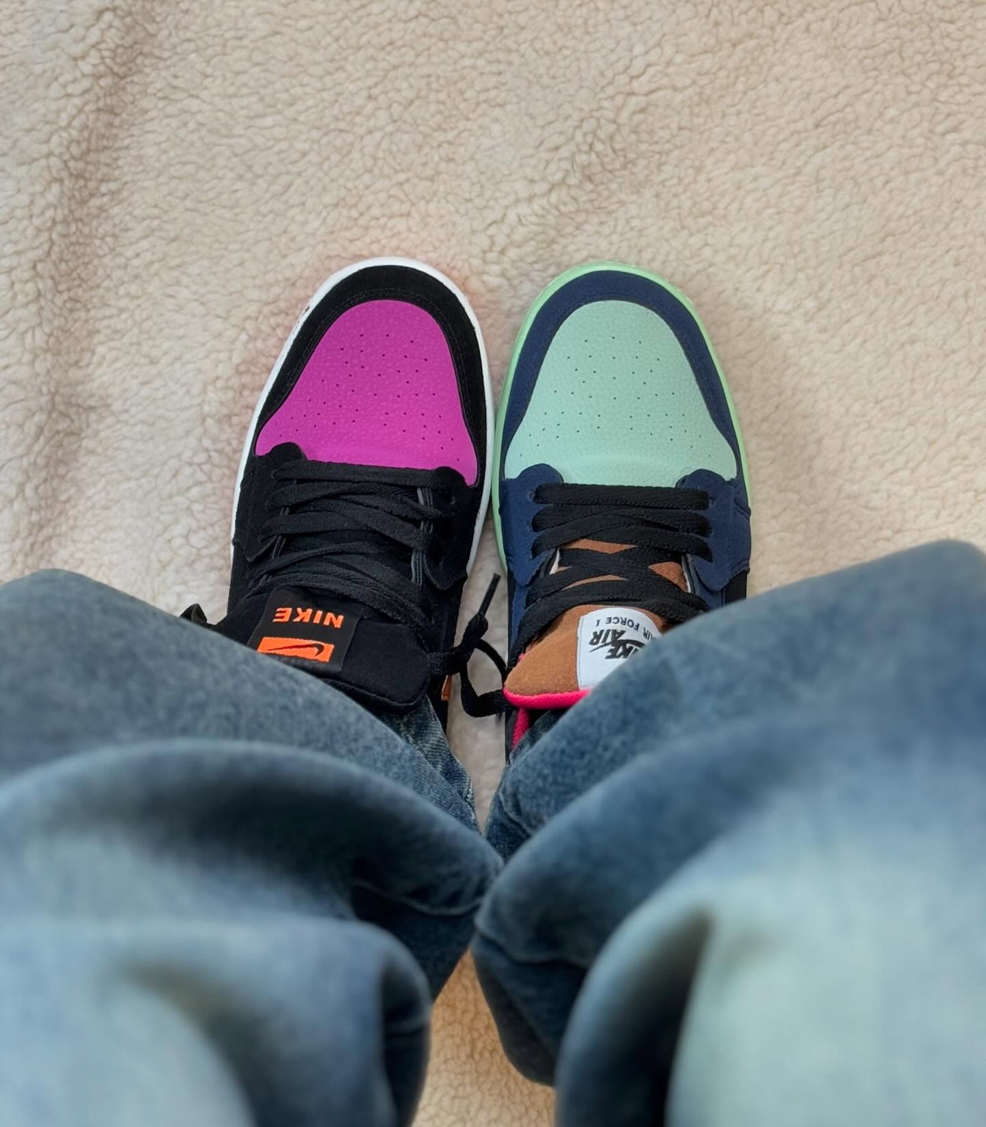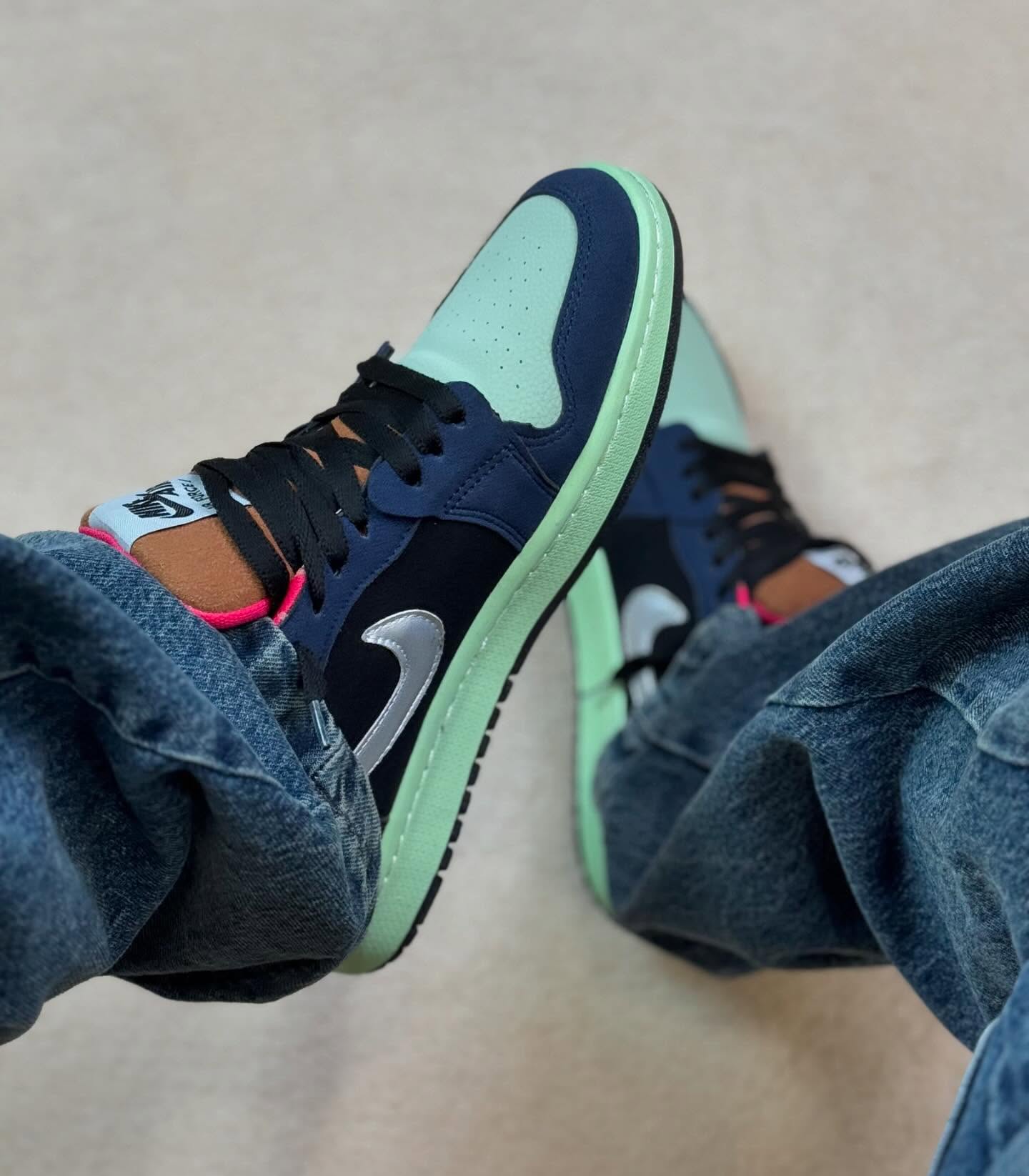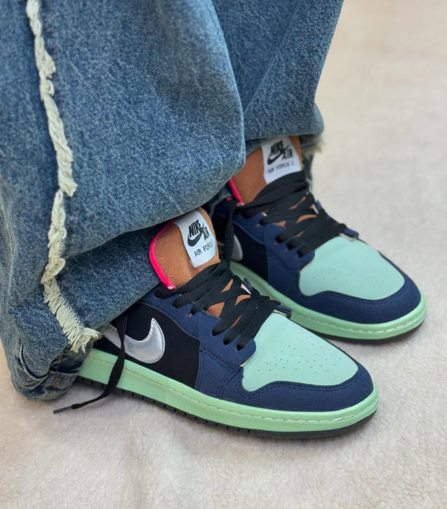 - سرمهای، سبز نعنایی و نقرهای: (مدل روی پا در تصویر اول) این ترکیب رنگی، حسی از خنکی، طراوت و مدرنیته را منتقل میکند. رویه اصلی سرمهای، با پنلهای سبز نعنایی در پنجه و زیره، تضادی جذاب و چشمنواز ایجاد کرده است. لوگوی نایکی (Swoosh) نقرهای متالیک و بخش کوچک صورتی در لبه داخلی کفش، به این پالت رنگی زیبایی خاصی میبخشند.