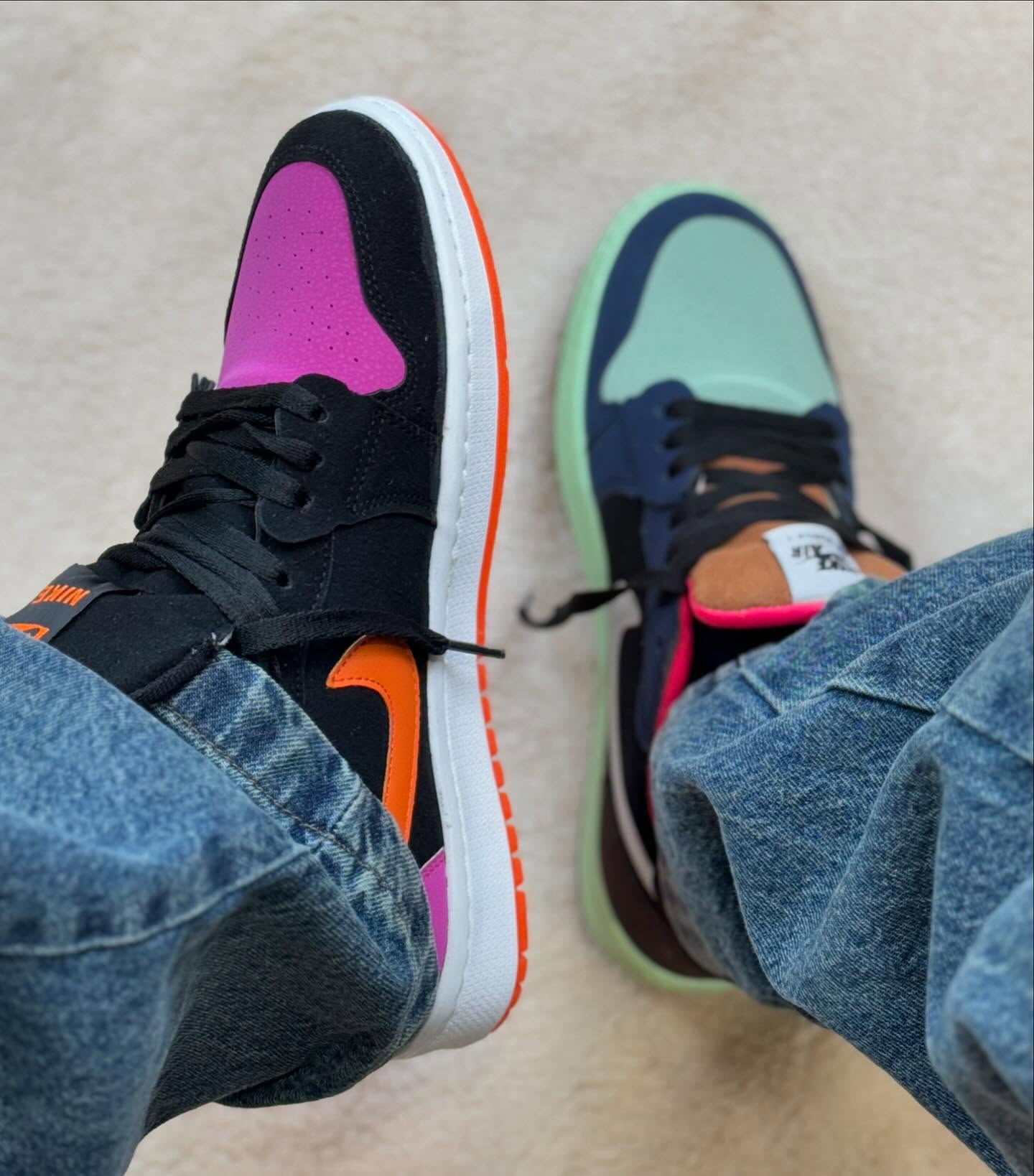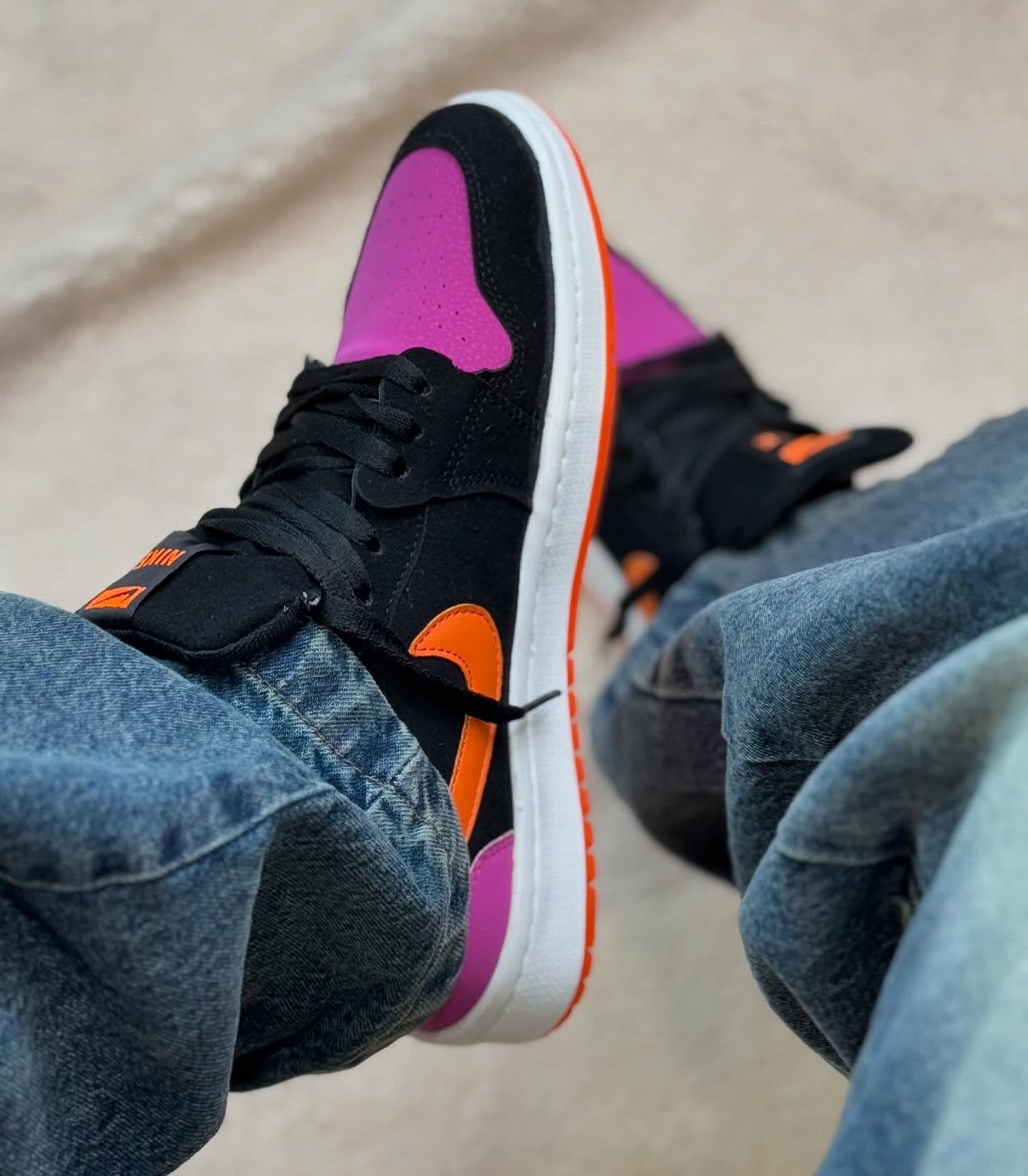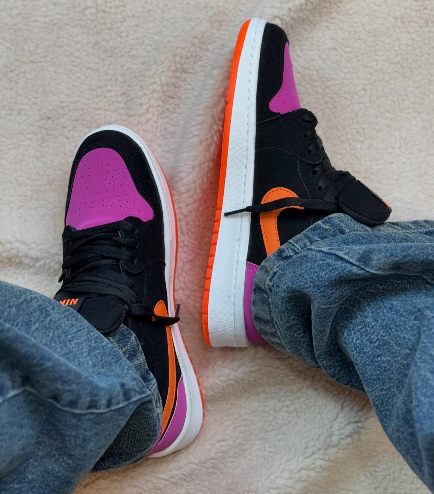 - مشکی، صورتی/مگنتا و نارنجی: (مدل روی پا در تصویر دوم) این ترکیب رنگی، جسورانه، پرانرژی و بسیار پویا است. رویه مشکی اصلی، با پنلهای صورتی/مگنتا در پنجه و دور مچ، و سویش نارنجی رنگ و زیره نارنجی، کنتراستی قوی و ظاهری بسیار مد روز به کتونی میبخشد.